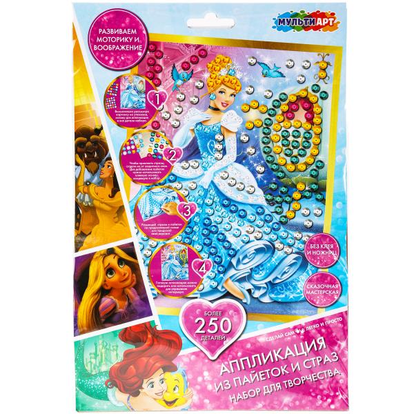 С помощью этого набора юный художник сможет самостоятельно создать сверкающую аппликацию с изображением очаровательной принцессы. Готовую поделку можно подарить близким или использовать для украшения интерьера.