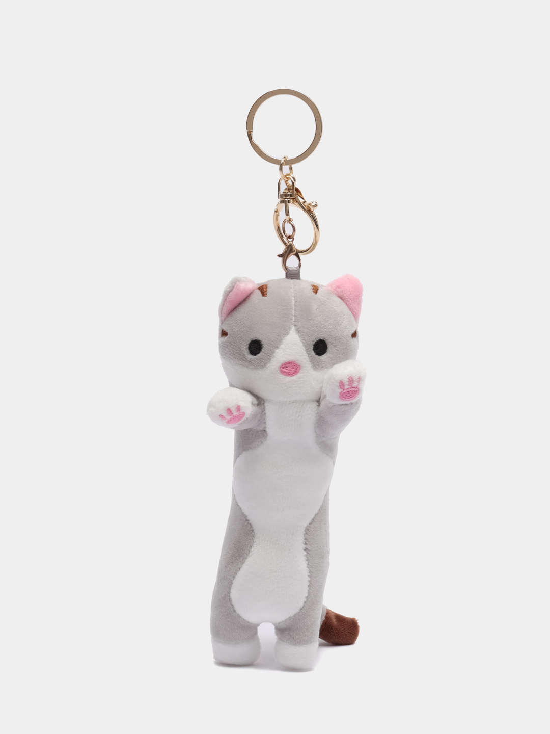 Брелок «Кот батон» – это мягкий брелок в виде вытянутого кота с поднятыми лапками, который крепится к ключам, рюкзаку или сумке с помощью металлического кольца и карабина.