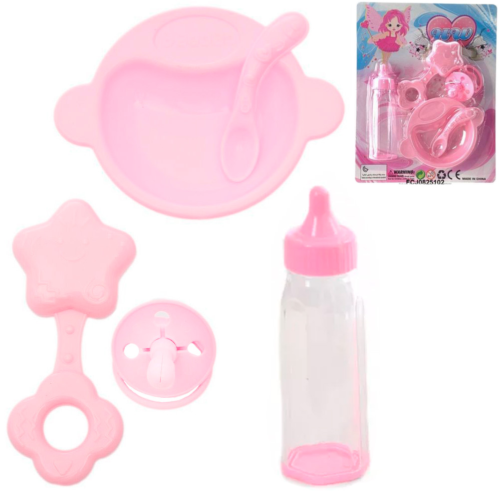 Набор включает бутылочку, пустышку, мисочку, ложку и погремушку, выполненные в ярких цветах для реалистичной игры в кормление и развлечение, изготовлены из ударопрочного пластика, полностью безопасного для детей. Аксессуары легко крепятся к пупсу и подходят для тематических игр в дочки-матери, стимулируя творчество и социальные навыки. Упаковка – блистер на картоне с подвесом для удобного хранения и демонстрации.