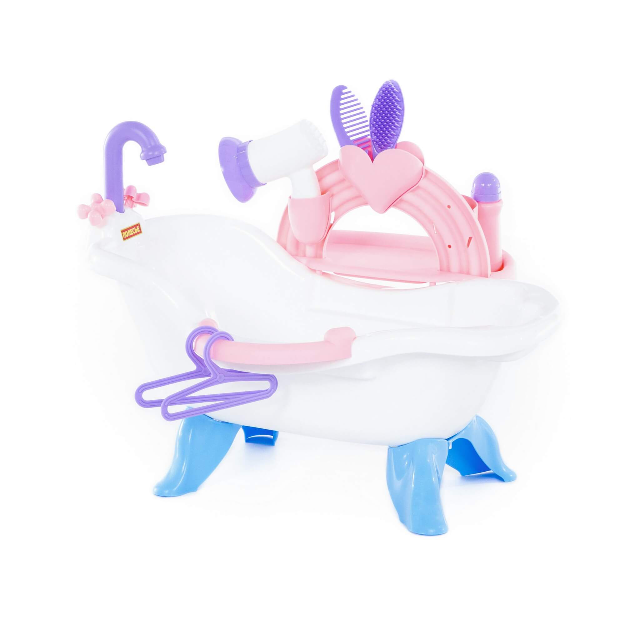 В наборе купания кукол №3 представлена просторная кукольная ванна с декоративным краном, высотой 25 см. и дополнительные аксессуары: зеркальце, фен, щетка и расческа, флакончик с косметическим средством, миниатюрные плечики для одежды (две пары). К левому боку ванной крепится элегантная полочка с фигурными пластиковыми «кармашками» для туалетных принадлежностей.