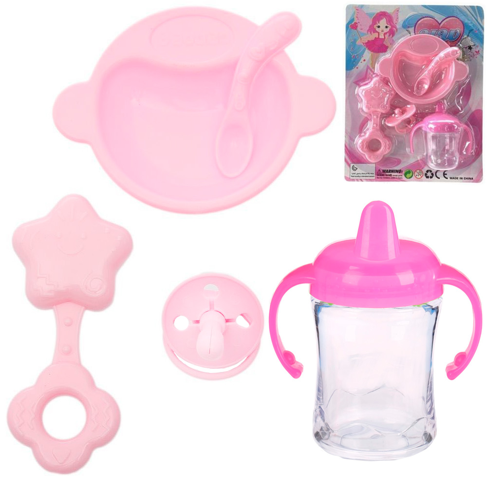 Набор включает 5 предметов: поильник, ложка, пустышка, мисочка и погремушка, выполненные из яркого пластика в разных цветах, подходящих для пупсов размером 20-30 см. Все элементы легкие, без мелких деталей, легко моются и фиксируются в игре, подходят для сценариев кормления и развлечения куклы. Упаковка на блистере с подвесом удобна для демонстрации и хранения, набор стимулирует творческие сюжеты о заботе о малыше.