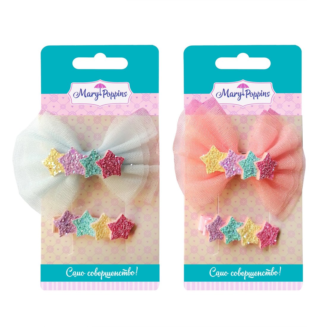 2 заколки, декорированные блестящими звёздочками разных цветов. Одна из заколок украшена ещё и фатиновым бантом.