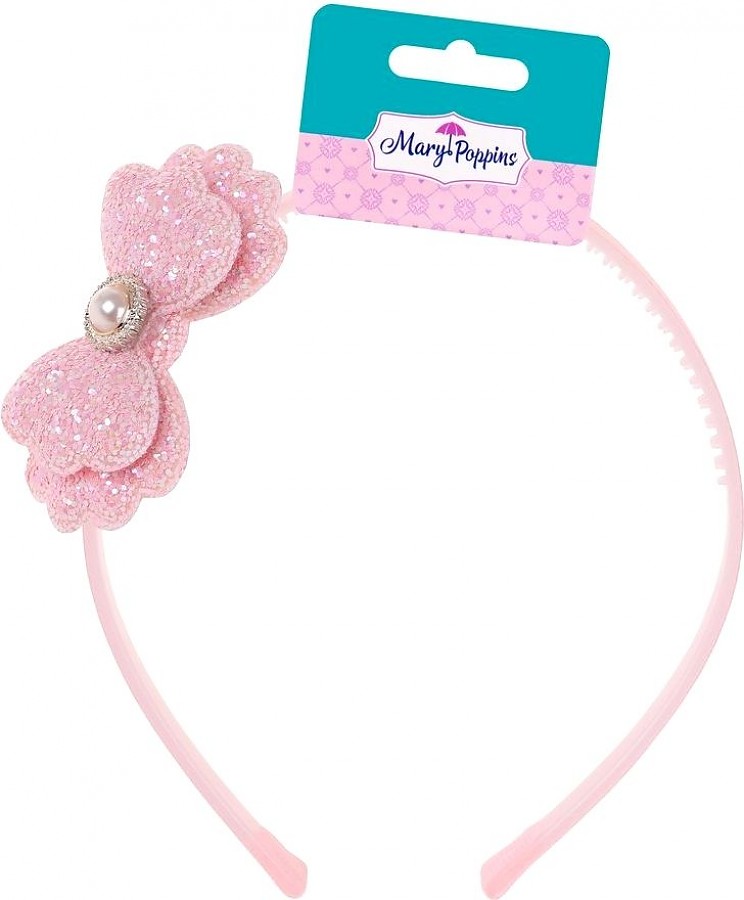 Ободок выполнен в приятном нежно-розовом цвете. Декорирован двухслойным бантом, покрытым сверкающими блёстками. Посередине бантика расположена перламутровая жемчужинка.