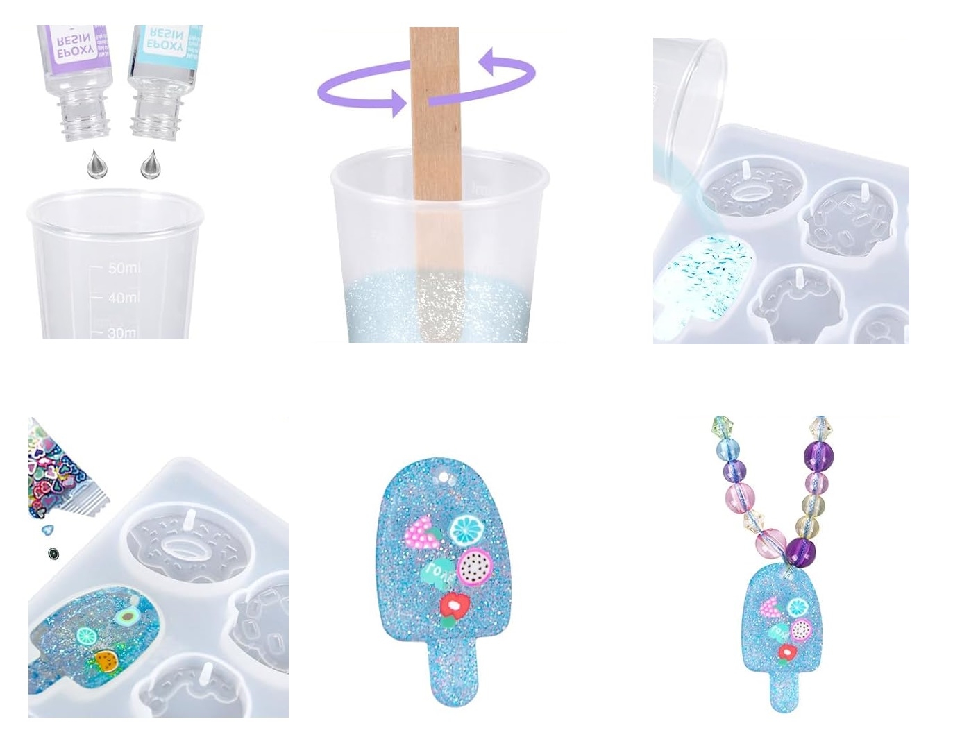 В набор входят: 2 флакона с эпоксидной смолой, 4 вида блесток, декоративный наполнитель, бусины, 2 шнурка, 4 цепочки, силиконовый молд (форма), мерный стакан, пинцет, 2 деревянные лопатки и лист наждачной бумаги для обработки готовых элементов. С помощью набора можно сделать браслеты, бусы, подвески, брелоки и другие аксессуары, развивая аккуратность, творческое мышление и чувство стиля.