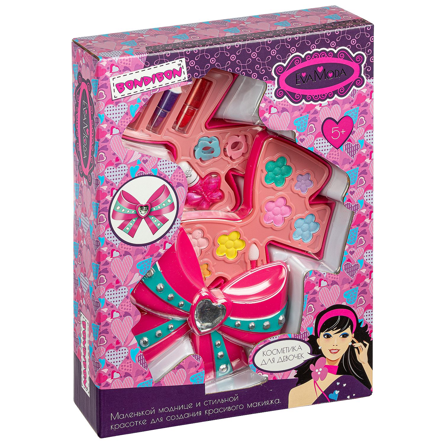 Набор детской декоративной косметики в косметичке в виде банта Eva Moda Bondibon - это набор аксессуаров для создания красивого макияжа, который необходим маленькой моднице! Всё должно быть, как у взрослой леди губные помады, лаки для ногтей, блески для губ, тени для век, румяна! Осталось применить творческий подход и создать свой неповторимый образ! Вся косметика гипоаллергенна и безопасна для детей, легко смывается с кожи водой.