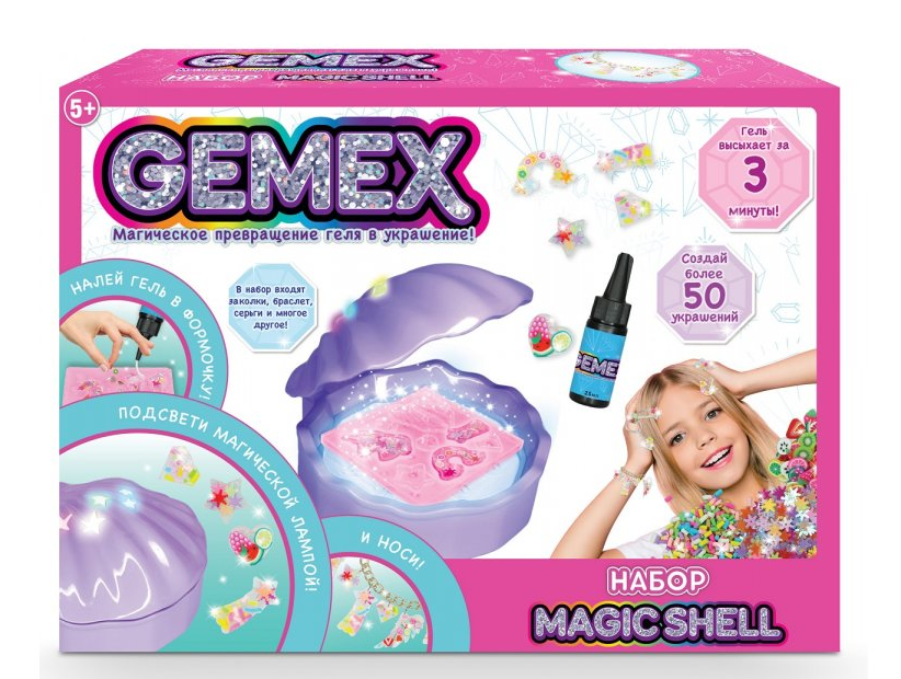 Набор для создания украшений и аксессуаров GEMEX, Magic shell (арт. HUN8898) – это тематический набор из полимерного геля с ультрафиолетовым затвердеванием, в котором главная «фишка» – емкость-«ракушка» с подсветкой. Внутрь «ракушки» помещаются заготовки с гелем и декором, а под действием УФ-света гель застывает и превращается в прочные прозрачные украшения. Такой набор подойдёт детям, увлекающимся созданием модных аксессуаров.