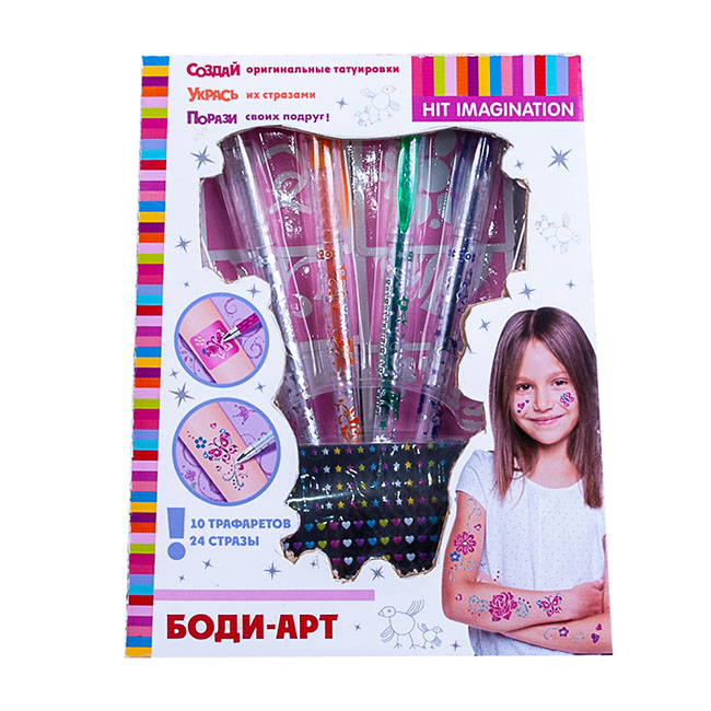Играй в мастера по созданию тату с набором Боди-арт! Делай цветные татуировки себе и своим друзьям, используя трафареты с рисунком, специальные цветные ручки для татуировок и стразы.
