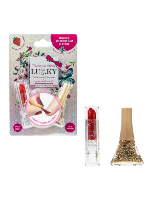 В набор входят - золотой лак Конфетти с блестками и детская красная помада с блестками.