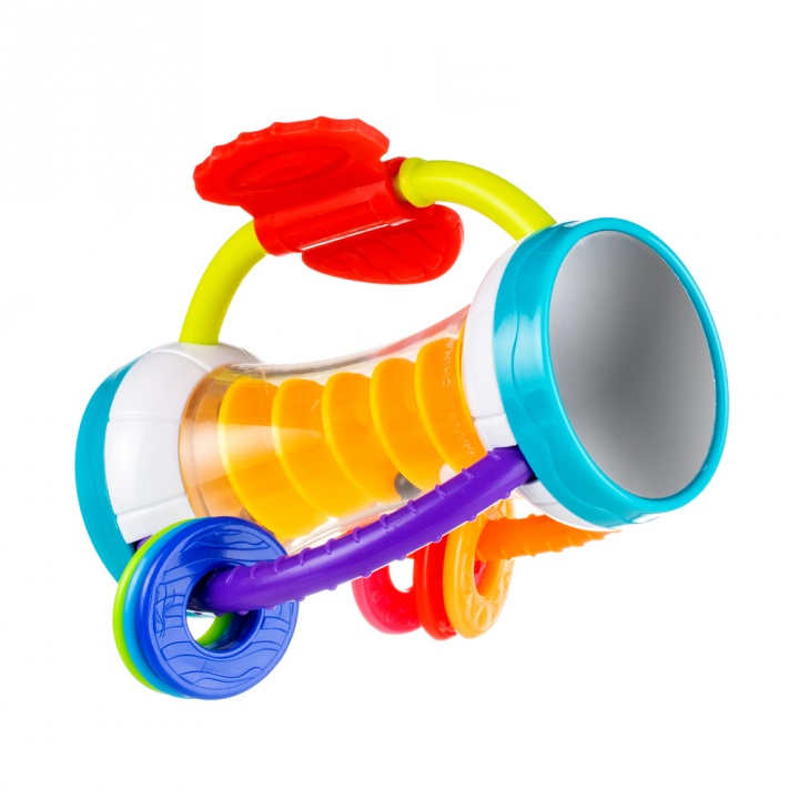 Погремушка выполнена в форме спирали с двумя удобными ручками с рельефной поверхностью. Внутри спирали находятся шарики, которые издают характерный для погремушки шум, который будет благотворно влиять на развитие слухового восприятия малыша. Яркие цвета стимулируют любознательность и запоминание, а рельефные ручки развивают тактильные ощущения. По бокам игрушки есть безопасное зеркальце, глядя в которое малыш научится осознавать себя.