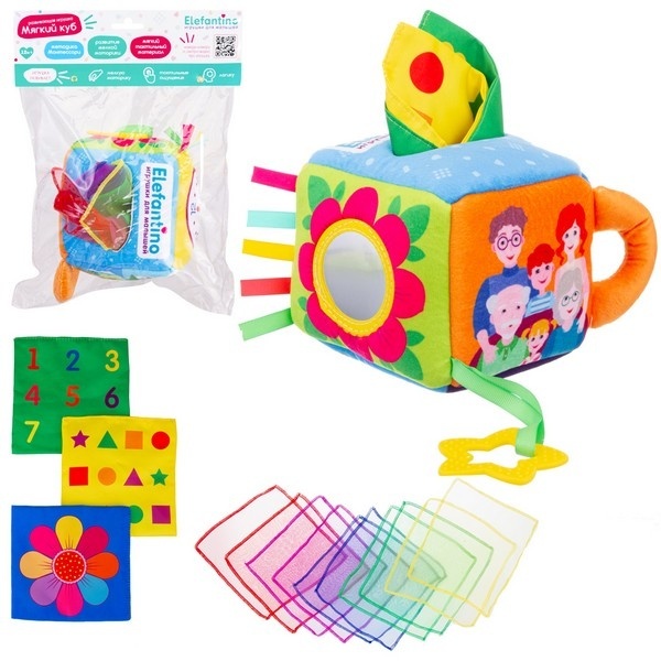 Мягкий куб сделан по методике Монтессори и развивает мелкую моторику, сенсорику и координацию движений.