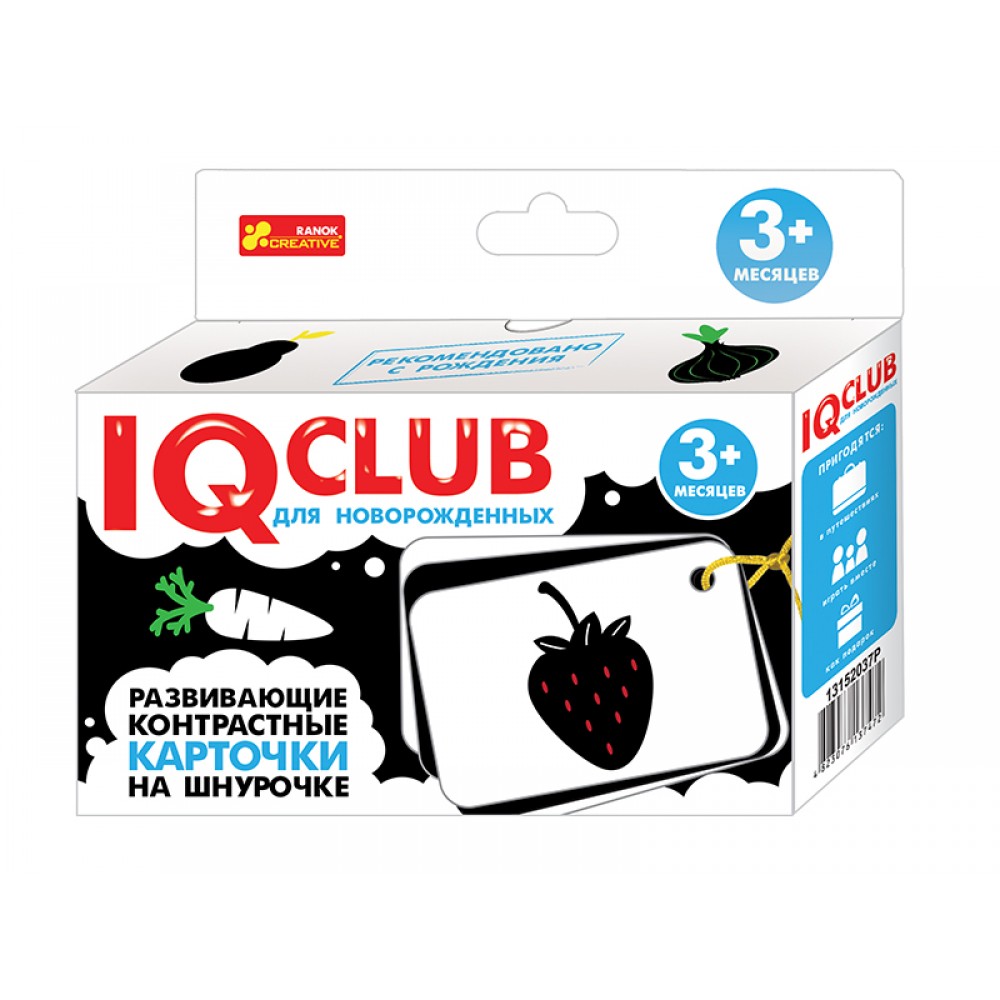 Набор включает 10 двусторонних карточек на шнурке, содержащих 20 контрастных иллюстраций.
