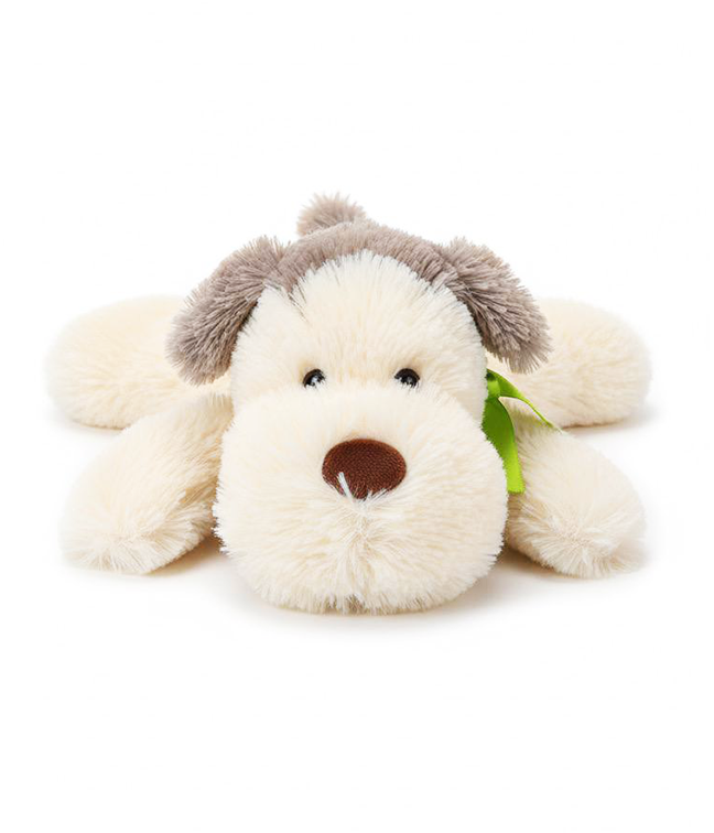 Мягкая игрушка «Собака с бантом» – плюшевая лежачая собачка сливочного цвета с мордочкой кремового оттенка и ушками контрастного, более тёмного тона. Игрушка выполнена из очень мягкого искусственного меха с приятным на ощупь ворсом, внутри – синтепон, благодаря чему собачку удобно обнимать и использовать как небольшую подушку-игрушку.