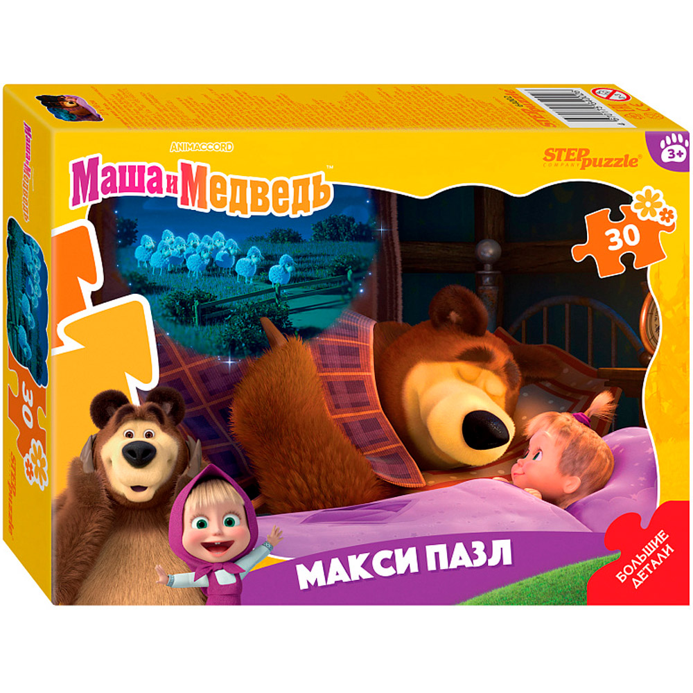 Пазл 30 МАКСИ Контурный «Маша и Медведь» (артикул 64002) от бренда Step Puzzle — детский пазл из 30 крупных элементов с изображением героев популярного мультсериала. Размер одной детали примерно 5 х 5 см, собранная картина имеет размеры 27 х 18 см. Пазл выполнен из прочного картона с яркой и качественной печатью.
