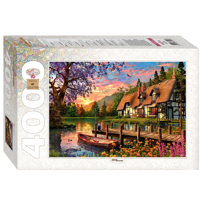 Пазл "Закат на озере в лесу" входит в серию "Art Collection". На картинке художник запечатлел маленький уютный домик, который стоит у самой кромки воды. На пирсе сидят кошка и собака, по озеру плавают утки. Все это похоже на начало какой-то сказки.