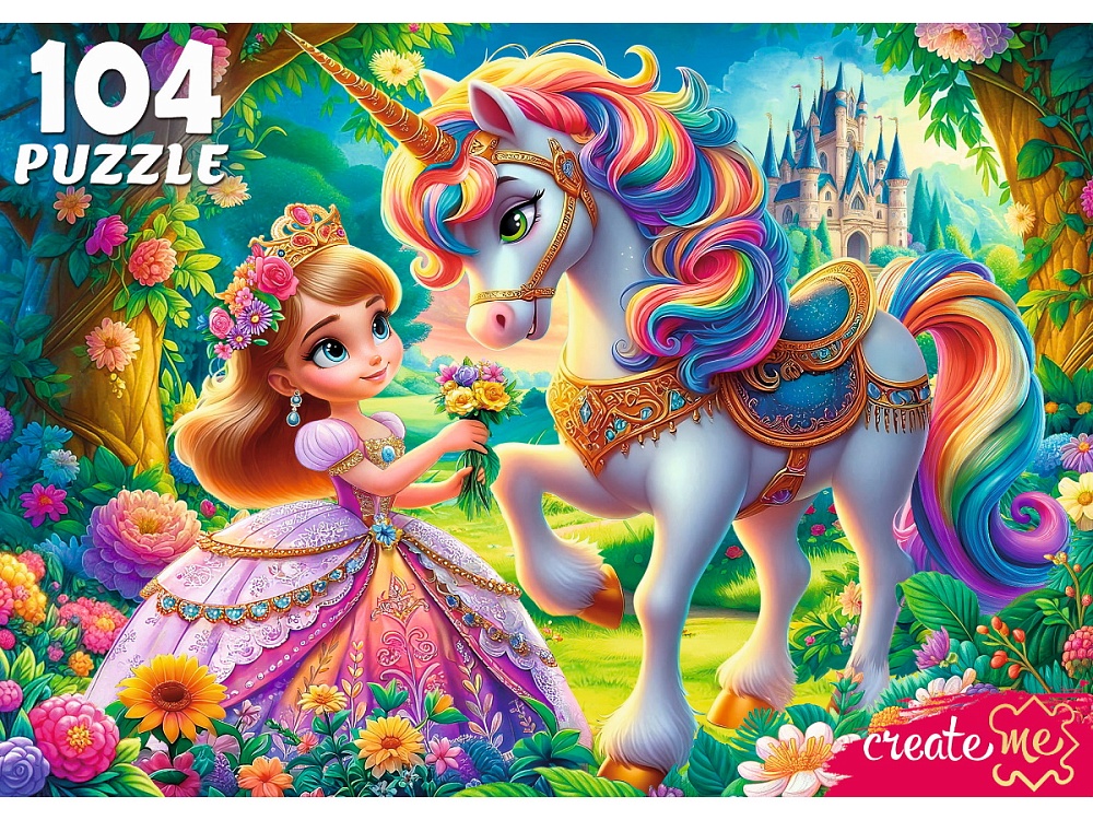 Ф104-6644 ПАЗЛЫ 104 элемента. ОЧАРОВАТЕЛЬНАЯ ПРИНЦЕССА И ЕДИНОРОГ (арт. Ф104-6644) — это детский пазл для сюжетно-ролевых игр.