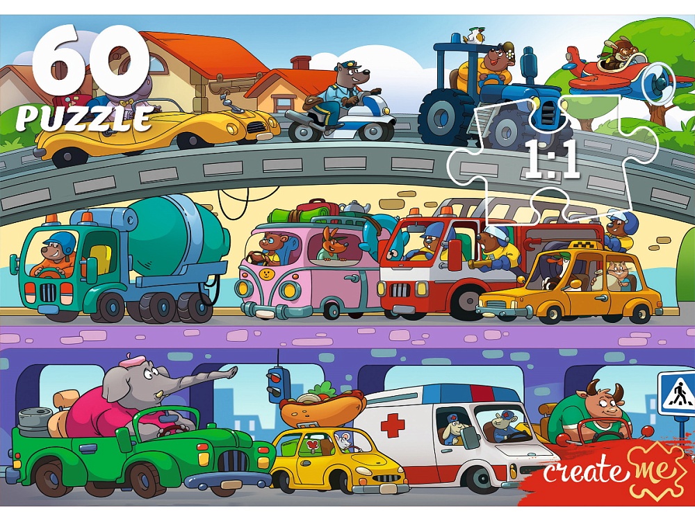 Пазл состоит из 60 крупных элементов, собирается в яркую картинку с грузовиками и спецтехникой. Легко собирается на столе или полу.