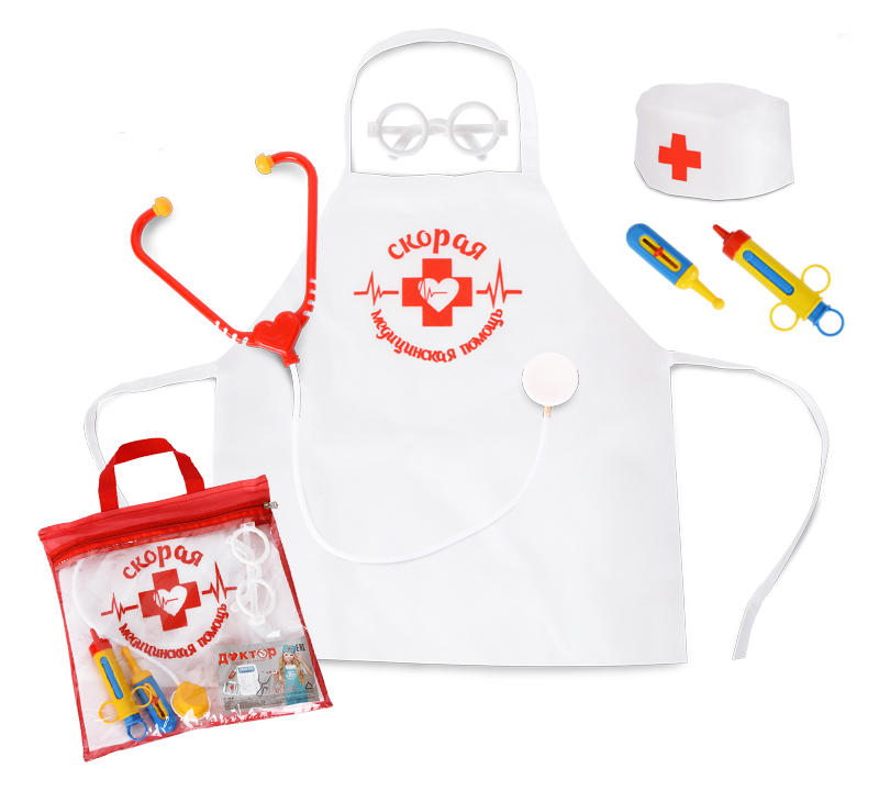 Тематический костюм «Доктор» — это сюжетно-ролевой набор. Его уникальность в том, что помимо докторской накидки и колпака в комплект входят медицинские инструменты, а фонендоскоп проводит звуки, благодаря полноценному снабжению силиконовой трубкой от ушек до мембраны, всё как у настоящего врача.