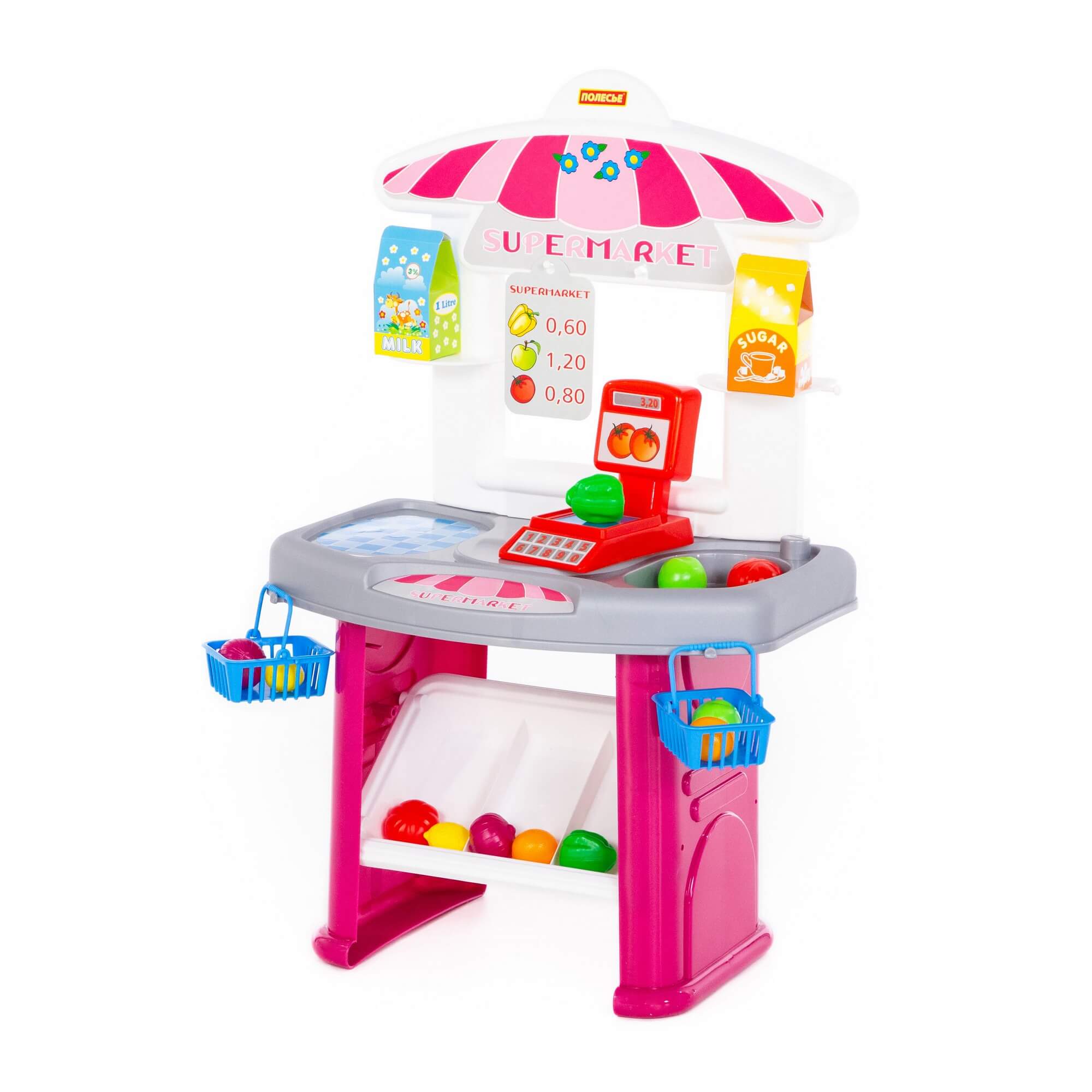 Набор-мини "Супермаркет" представляет собой маленький прилавок и витрину, где продаются фрукты и овощи:
