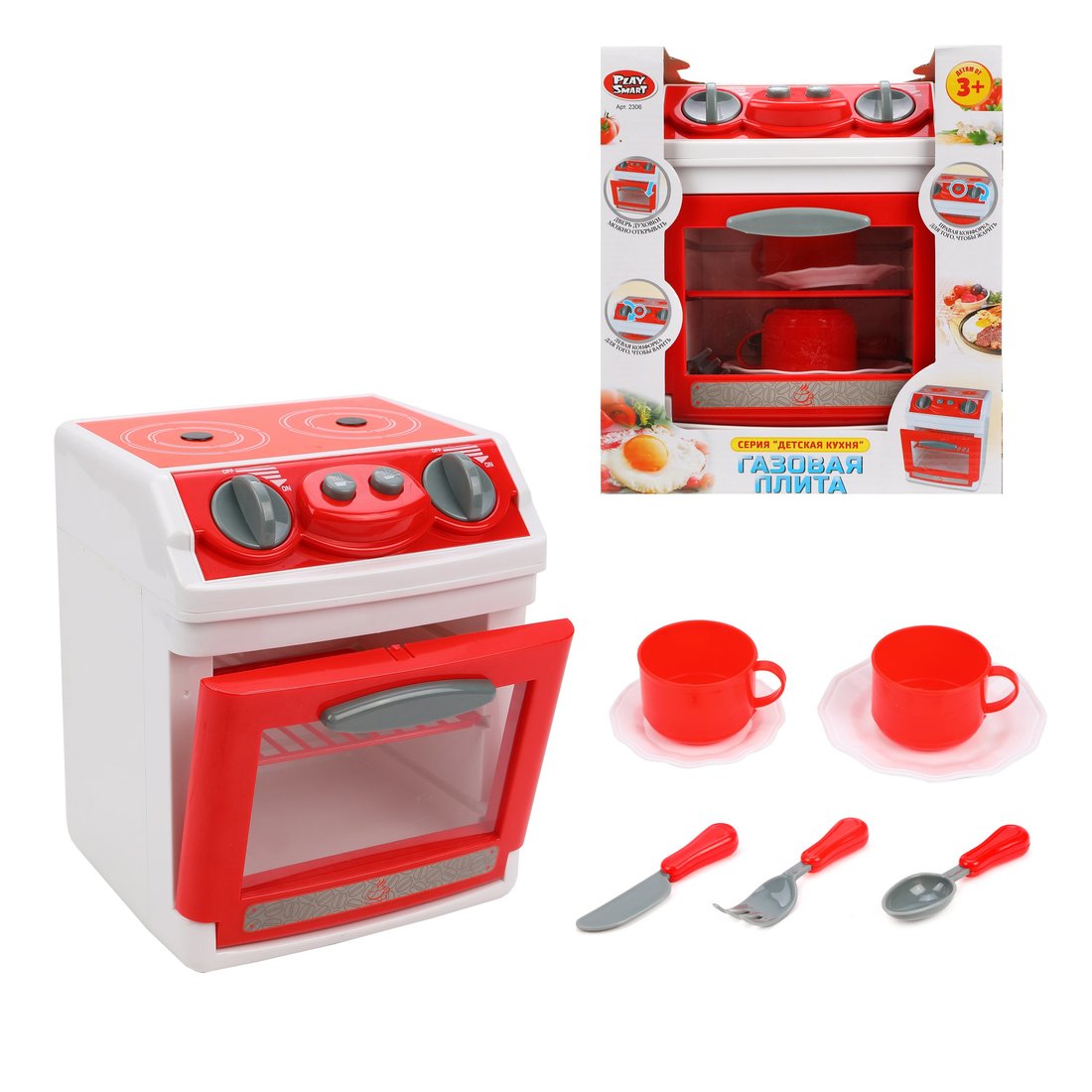 Две конфорки - два режима приготовления еды (варка и жарение). Дверь духовки открывается. В наборе – посуда. Игра сопровождается световыми эффектами (подсветка конфорок). Игрушка работает от 3 батареек «АА»