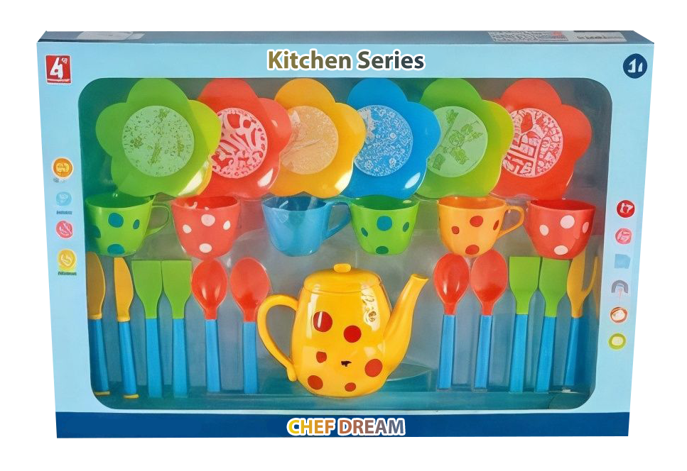 «Набор «Посуда» — это замечательный комплект для сюжетно-ролевых игр, который позволит ребёнку почувствовать себя настоящим поваром. В наборе есть всё необходимое для того, чтобы устроить весёлое и увлекательное чаепитие: тарелки, чашки, блюдца, ложки, вилки и ножи. Играя с набором, ребёнок развивает воображение, координацию движений и мелкую моторику рук, а также учится гостеприимству и аккуратности».