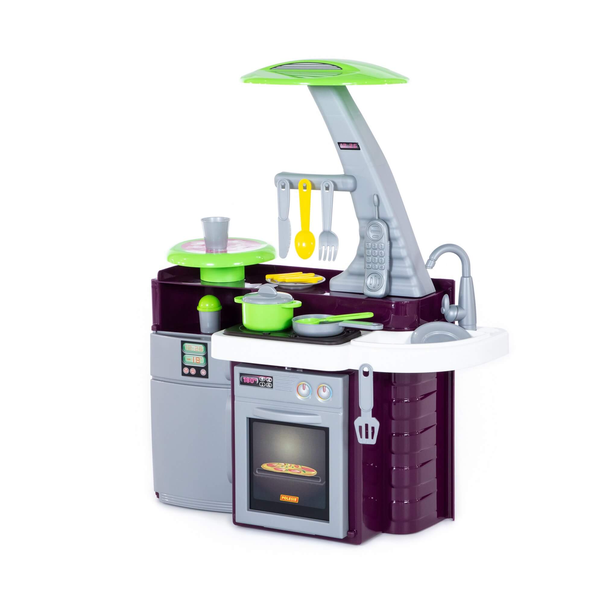 Кухня оснащена электронной озвученной варочной панелью с подсветкой. На панели 4 кнопки: две для включения правой и левой конфорок. Одной кнопкой включается звук вытяжки, второй - 3 развлекательных мелодии. Включение конфорки приводит в действие подсветку, после чего появляется звук "жарки". Через 2 секунды после выключения конфорки выключается звук, затем гаснет подсветка.