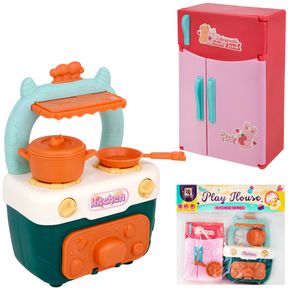 Набор включает модель холодильника с открывающимися дверцами и полками для хранения продуктов, а также плиту с имитацией конфорок и духовкой, дополненные 3 аксессуарами для готовки (сковорода, кастрюля, посуда). Все элементы выполнены из яркого прочного пластика без острых краев, подходят для игр с куклами или ролевых сценариев приготовления еды, легко моются и не ломаются при падении. Упаковка в пакете с хедером удобна для хранения и демонстрации, набор компактный для игр дома или в саду.