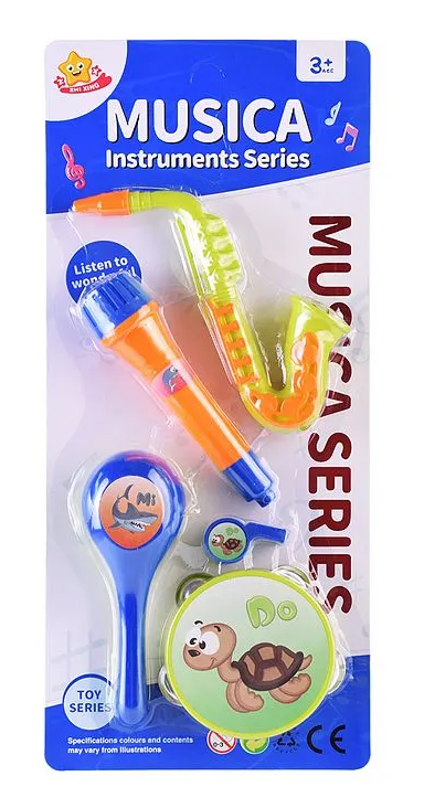 - в наборе: бубен с металлическими бубенцами (10 х 10 х 2,5 см), маракас (16 х 5,5 х 5 см), саксофон (17 х 3,5 х 15 см), микрофон (16 х 4 х 4 см), свисток