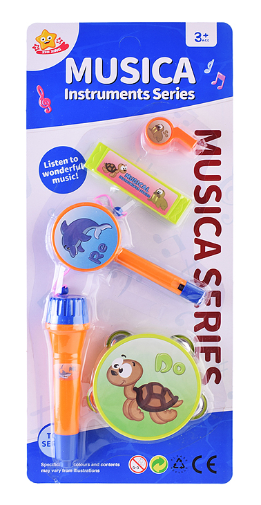 - в наборе: бубен с металлическими бубенцами (10 х 10 х 2,5 см), колотушка (15 х 6 х 6 см), гармошка (10 х 2,5 х 1 см), микрофон (16 х 4 х 4 см), свисток