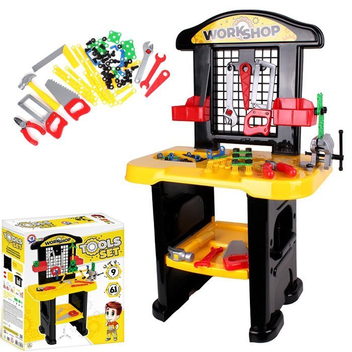 Настоящая игрушечная «Мастерская» для маленьких папиных помощников. Большой, удобный и устойчивый стол со столешницей с отверстиями и резьбой для винтов, набор инструментов, планки, гайки и болты - все, что нужно для юных мастеров.
