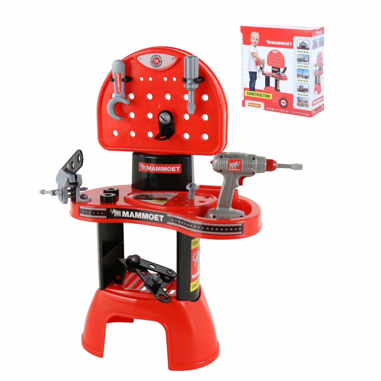 В комплект входит удобный игровой столик, на котором размещены ключ, отвертка, тиски, дрель и различный крепеж. С таким набором малыш сможет создать собственную игрушечную мастерскую, познакомиться с назначением инструментов и крепежа, развить навыки мелкой моторики, логическое мышление и воображение.
