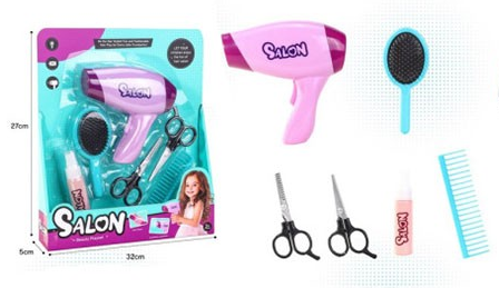 Набор включает 6 пластиковых аксессуаров: фен, две расчески, две ножницы и флакон для спрея, выполненные в ярком дизайне с реалистичными деталями для имитации стрижки и укладки. Все предметы легкие, без острых краев, безопасны для детского использования, подходят для сюжетных игр с куклами или друзьями. Игрушка помогает осваивать сценарии ухода за волосами через творческую игру, стимулирует интерес к профессиям. Упаковка – картон с блистером.