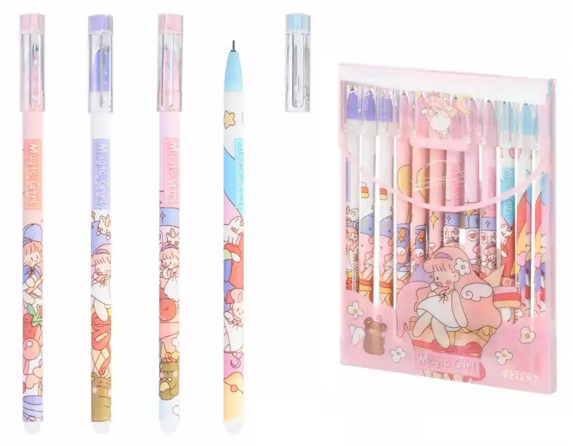 Ручка пишет-стирает гелевая : "Волшебная девочка"; цветной корпус с рисунком /ассорти/; толщина пишущего наконечника-0,5 mm; цвет чернил-синий, в пластиковом блистере.