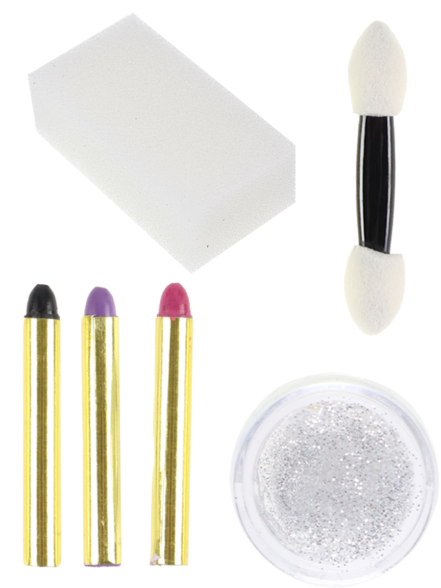 В комплекте: 8 цветов (чёрный, белый, серый, оранжевый, фуксия, розовый, бирюзовый, красный), 3 карандаша (чёрный, фуксия, фиолетовый), 1 гель для тела и лица (серебряный), 1 спонж и 1 аппликатор.
