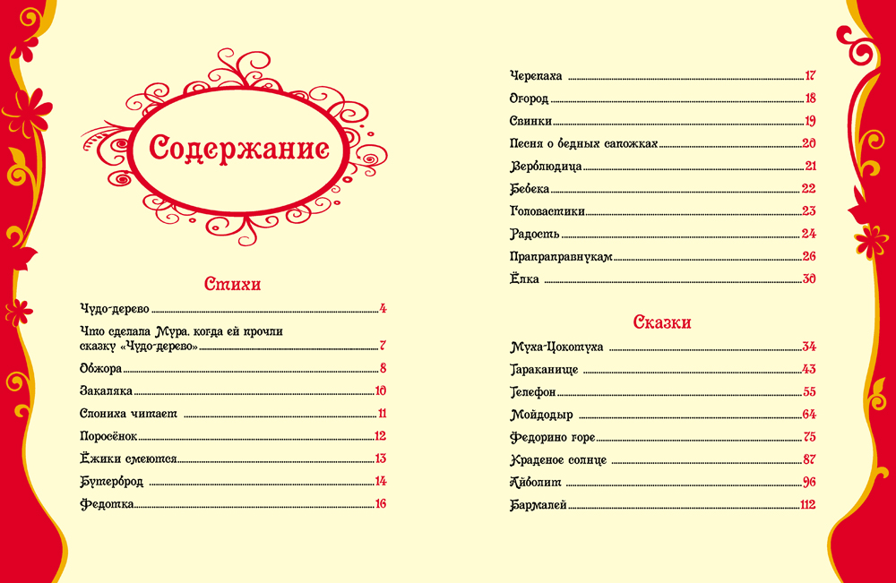 В книгу вошли популярные произведения детского писателя: сказки «Муха-Цокотуха», «Тараканище», «Телефон», «Мойдодыр», «Федорино горе», «Краденое солнце», «Айболит», «Бармалей»: стихи «Чудо-дерево», «Обжора», «Закаляка», «Ёжики смеются», «Верблюдица» и другие, а также загадки.