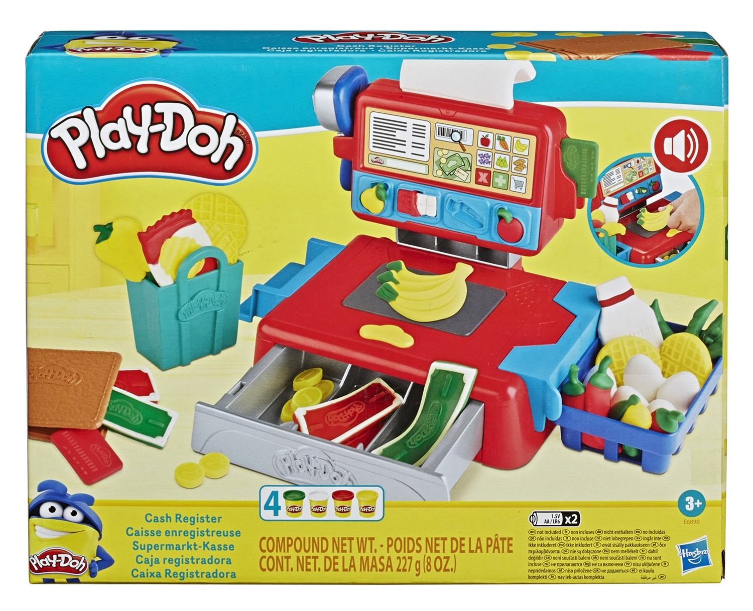 в комплект входят имитации продуктов питания, игровые монеты и банкноты