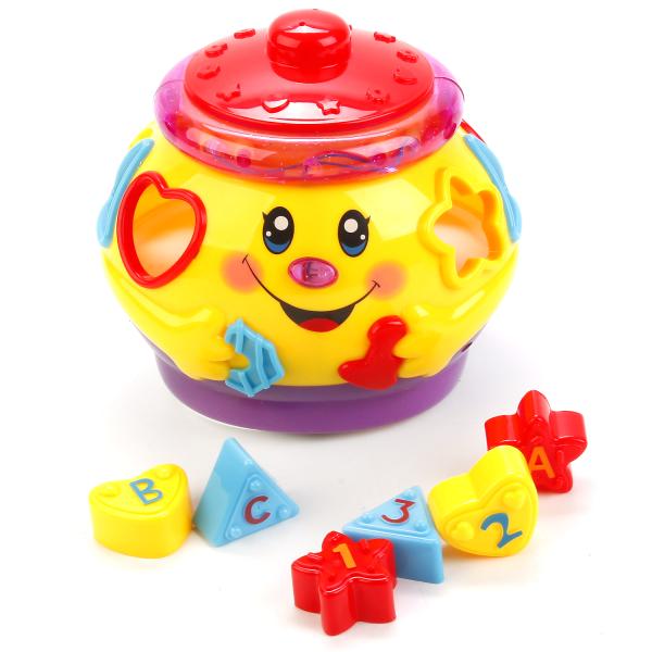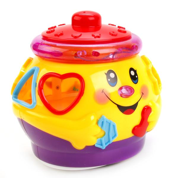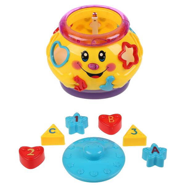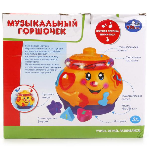 Обучающая игрушка "Музыкальный горшочек" Умка B503-H05075RU имеет 8 обучающих функций и светящиеся элементы. С ее помощью малыш выучит буквы и цифры. "Горшочек" проигрывает песню из мультфильма, а его яркие цвета и подсветка способствуют развитию визуального восприятия. Сортер с разноцветными геометрическими фигурами поможет развить мелкую моторику, тактильные ощущения и координацию движений.