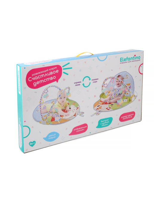 Развивающий коврик, фирмы Elefantino мягкий IT106280. Отличный детский коврик, для малышей. Изготовлен из приятного на ощупь текстиля, с фиксацией малыша. Есть два положения для малыша (лежа и сидя). Есть 5 подвесных погремушек в приятной цветовой гамме.