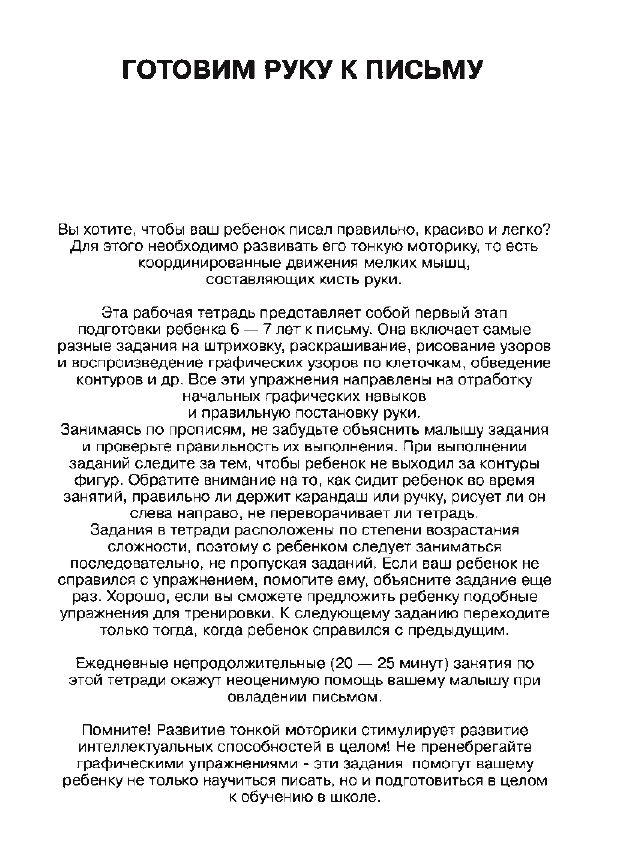 Рабочая тетрадь представляет собой первый этап подготовки ребенка 6- 7 лет к письму. Она включает упражнения, направленные на отработку начальных графических навыков и правильную постановку руки. Книгу можно использовать как на групповых занятиях в детских садах и в начальной школе, так и для индивидуальной работы с детьми.