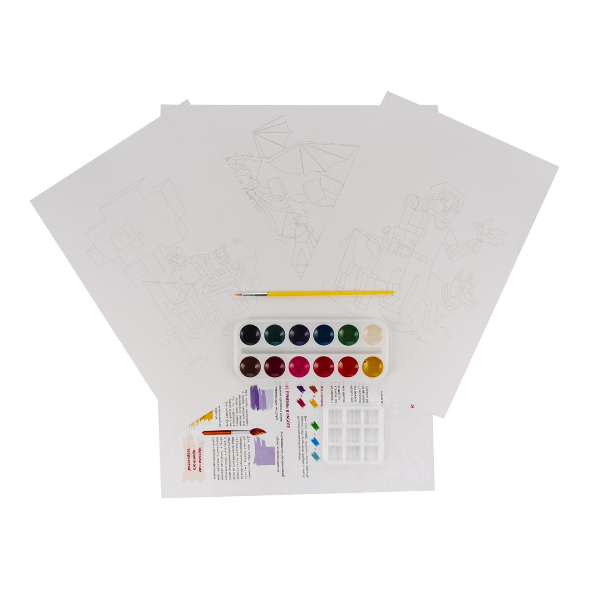 Комплектация: 3 основы с нанесённым контуром, краски, кисть, палитра, инструкция.