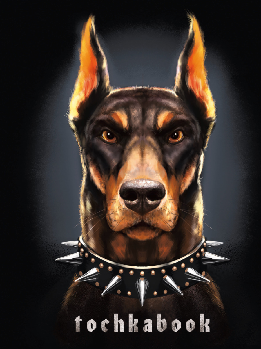 Точкабук с брутальными доберманом можно рассматривать в качестве подарка для мужчины, начальника, делового партнёра, особенного клиента. Сдержанные цвета и тёмный фон придают обложке благородный вид. Блокнот покрыт фактурным лаком и фольгой, которую становится видно, когда на блокнот попадает световой блик. В точкабуке 72 белых листа в мелкую серую точку. Такой блокнот подойдёт для деловых и творческих записей.