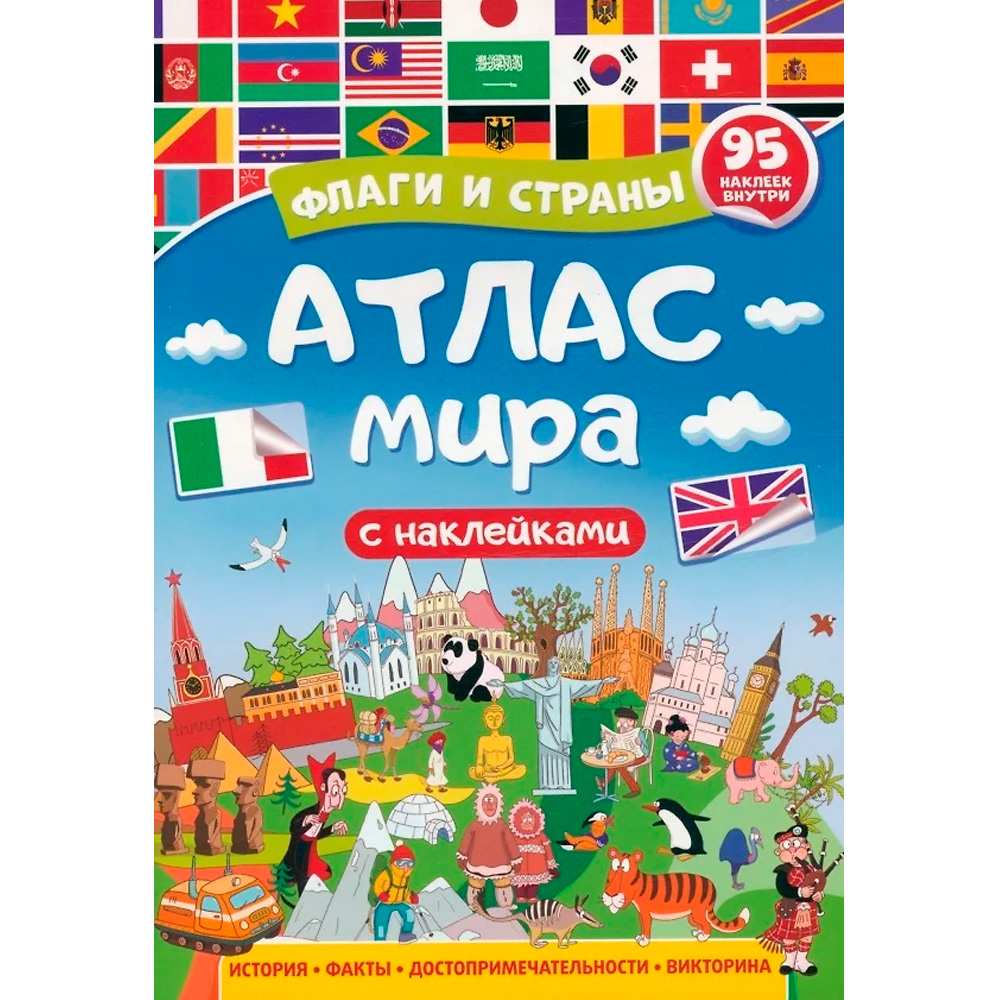 В книге 32 страницы, мягкая обложка, иллюстрации с яркими флагами и картами стран дополняются занимательными заданиями, раскрасками и игровыми элементами для лучшего усвоения материала. В атласе представлен большой плакат-карта мира и набор наклеек с флагами, которые ребёнок может размещать на карте, что облегчает восприятие и делает обучение интерактивным.